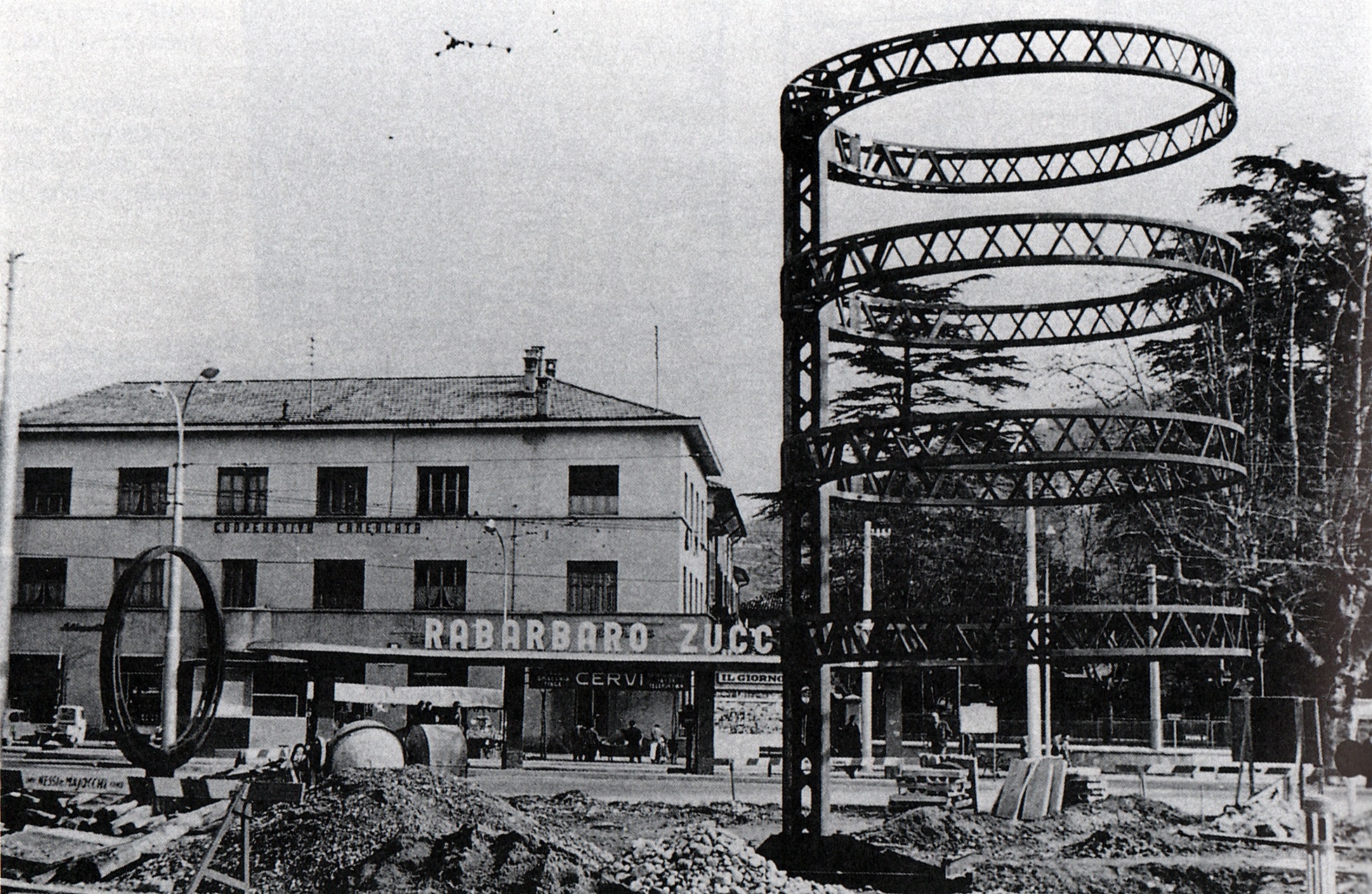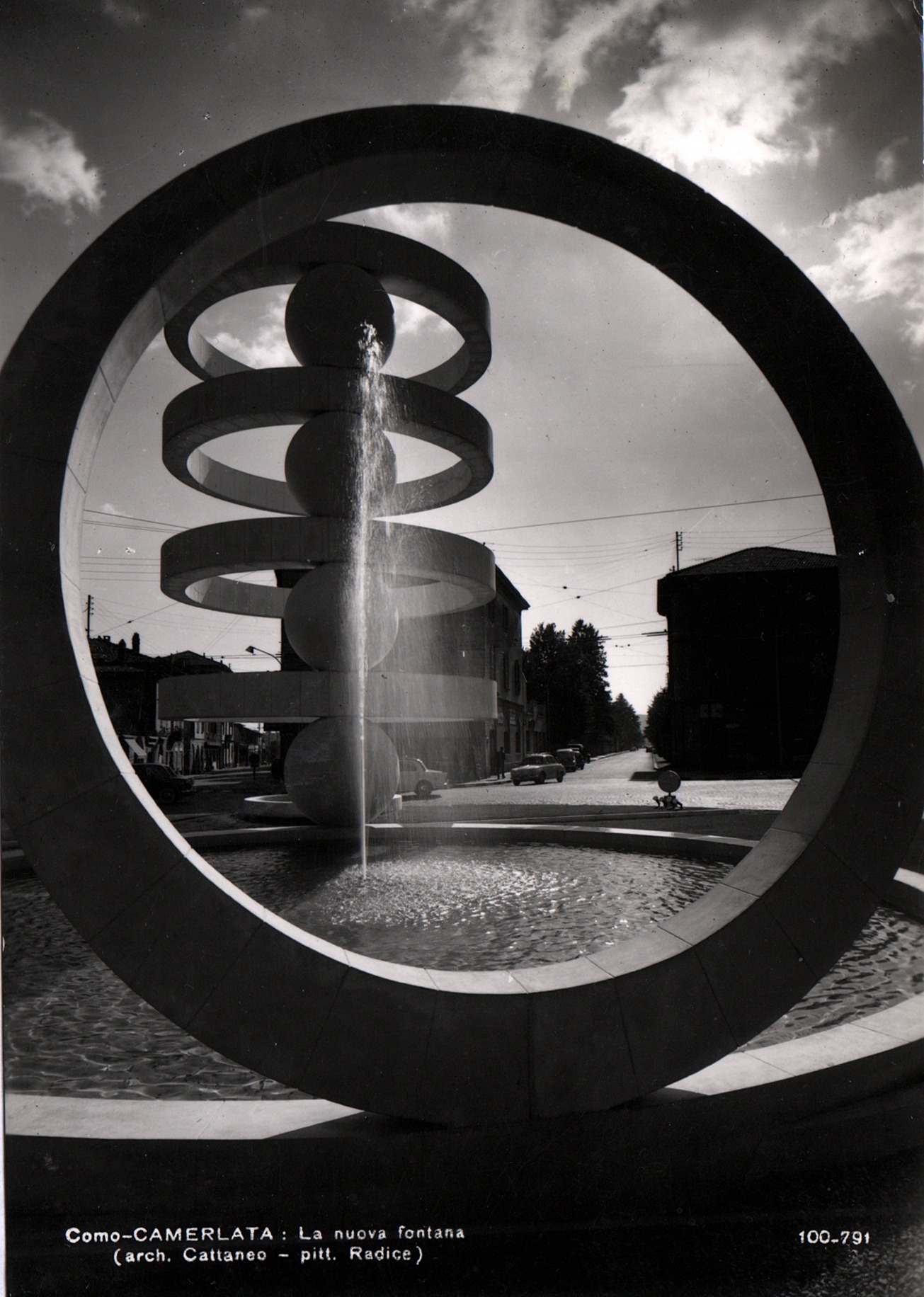 Mario Radice, dal canto suo, era un artista legato all’astrattismo, movimento che cercava di allontanarsi dalla rappresentazione figurativa per concentrarsi su forme e colori puri. Per Radice, l’arte doveva esprimere l’essenza delle cose, non la loro immagine esteriore. Nella Fontana di Camerlata, le sfere e gli anelli si dispongono in modo astratto e armonioso, evocando un senso di equilibrio e leggerezza a cui l’artista tenta di dare forma.