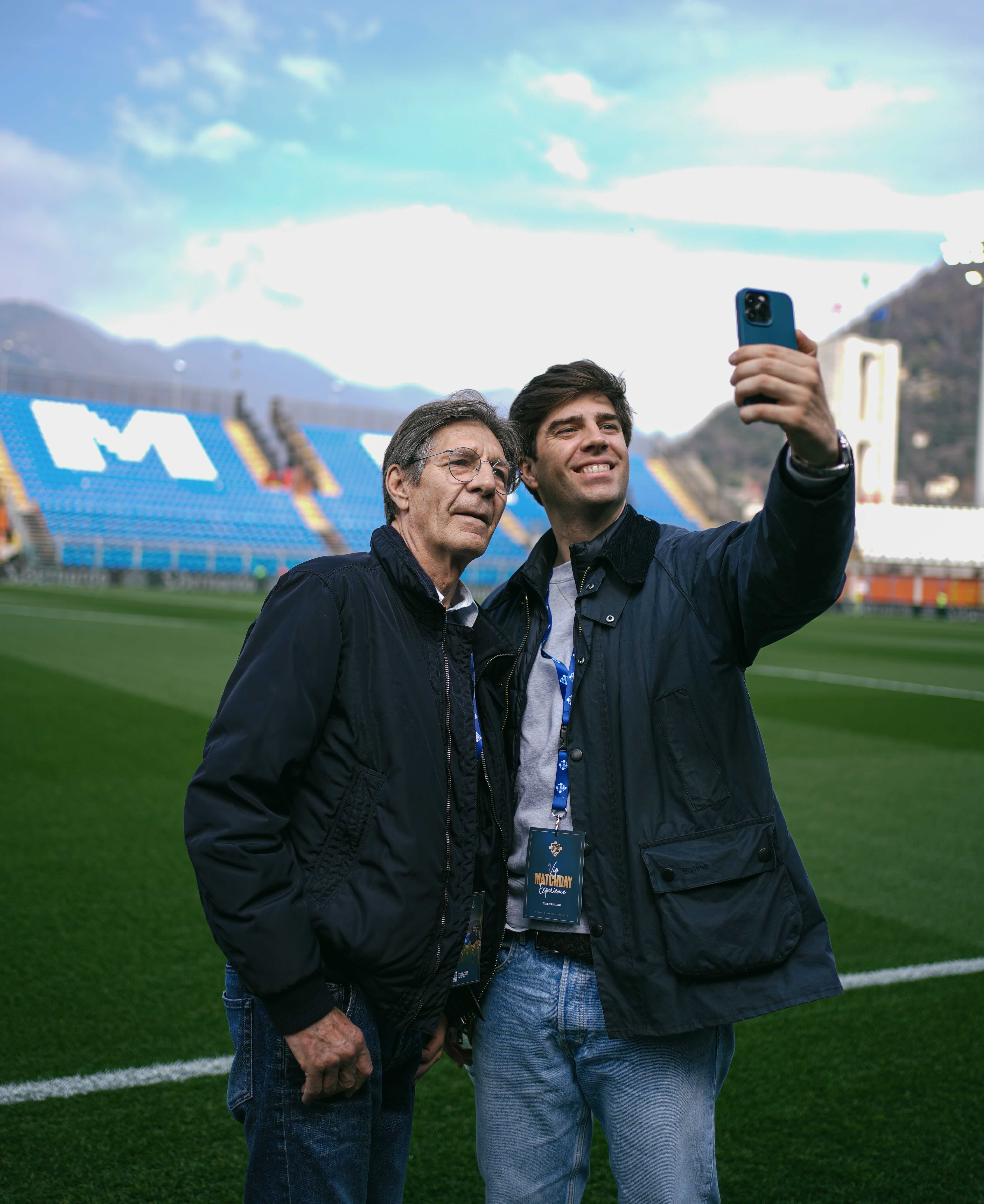 Da lì si passa al dietro le quinte: sala stampa, tunnel, spogliatoi, per poi calcare il prato a pochi metri dai giocatori in fase di riscaldamento. E quando il match ha inizio, il posto riservato in Tribuna Centrale regala una perfetta visuale del gioco, incorniciata da uno sfondo senza eguali: il campo davanti e il lago e le montagne sul retro.
